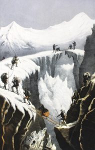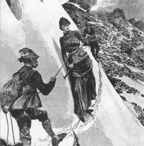 Henriette d’Angeville during her ascent of Mont Blanc. Among the most famous female exploits was that of Henriette D’Angeville, the second woman on the summit of Mont Blanc, in 1838. she cuttingly claimed to be the first woman to summit Mont Blanc who was “still capable of remembering her impressions”. Of course she was referring to Marie Paradis, who had reached the coveted summit 30 years earlier in such a miserable state that all she could remember was that, “Everything around was white and down below was black.”